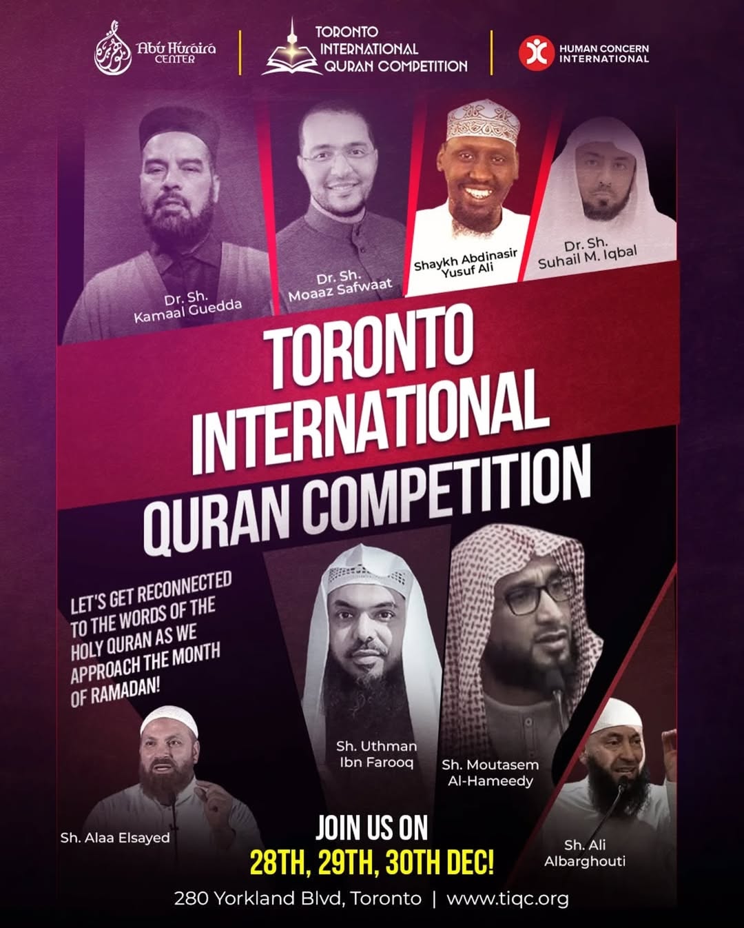 Toronto International Quran competition December 28, 2024 4:00 pm USA 280 Yorkland Blvd, Toronto Google Map Tickets Let’s Reconnect words of the Holy Qur’an as we approach the month of Ramadan!